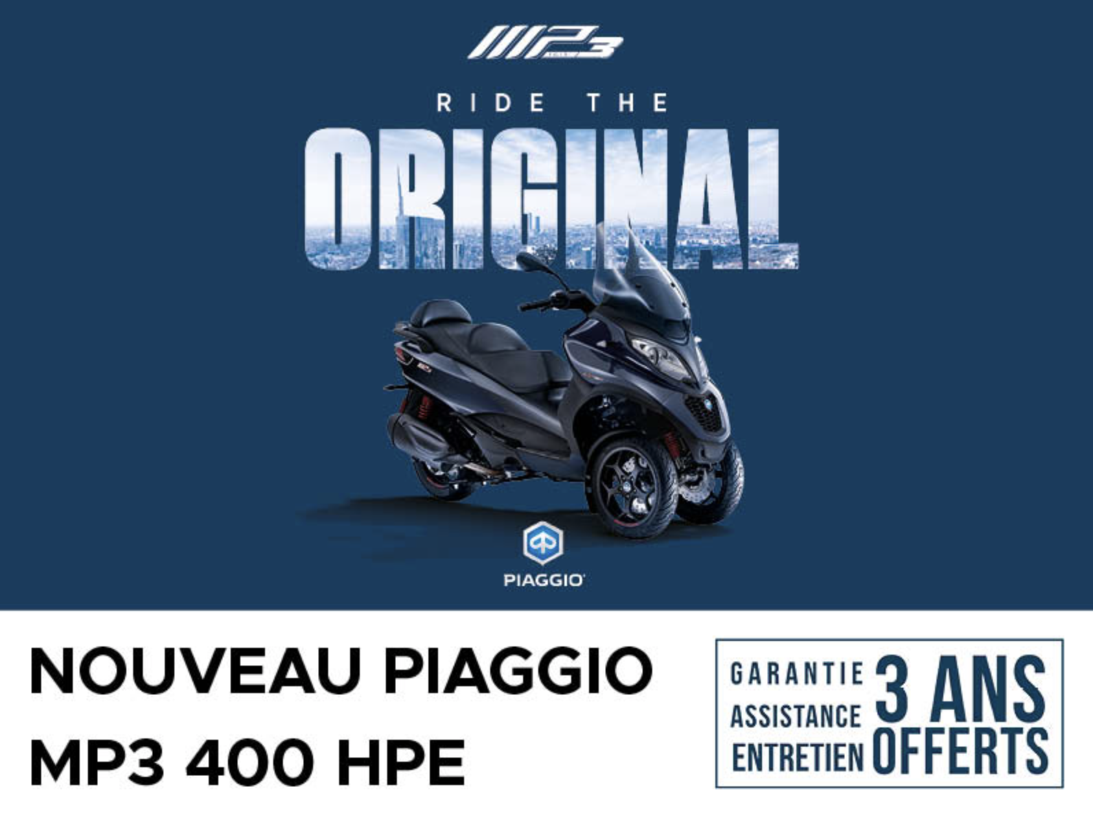 ivez une nouvelle expérience de conduite au guidon du Piaggio MP3 400 hpe accessible avec votre permis Auto(1) et profitez de l'entretien 3 ans offerts.
